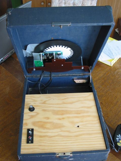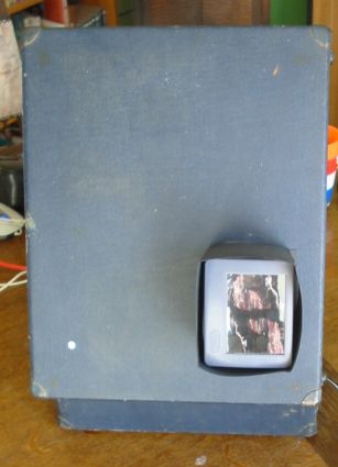 Also machte ich mich auf die Suche nach einem passenden Gehäuse, wo noch Platz bleibt eine stärkere Linse einzubauen. Fündig geworden bin ich bei einem alten Koffergrammophon, wo das Innenleben von dem Vorbesitzer bereits entfernt worden ist, kein Grammophon musste somit sterben für diese Bastelei. Die Linse stammt vom Flohmarkt, sie war als Vergrößerungsglas für einen Gameboy gedacht. Einfach die Forderfront des Gerätes entfernt, und den Televisor in den Deckel des Grammophons geschraubt. Zuvor habe ich natürlich ein "Guckloch" in den Deckel gebohrt. Die Linse ist in einem einfachen Aufbau auf den Deckel gesetzt. In den Unterteil des Grammophons habe ich eine Sperrholzplatte gesetzt. Diese nimmt das Netzteil auf, außerdem einen kleinen 1 Watt Verstärker (Bausatz aus dem Elektroladen) und die Anschlüsse im Cinch-Format für die Bildquelle.