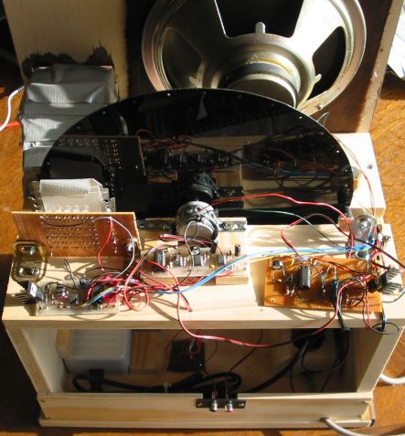 Sieht chaotischer aus als es ist. Rechts der Synchronschaltkreis, noch nicht komplett angeschlossen. In der Mitte, vor dem Motor der Vorversärker und Synchronseparator, links vor den LEDs der Videoverstärker. Nicht im Bild: Der Audioverstärker. Die ganzen Kabel sind noch nicht sauber verlegt, dabei ist es eigentlich ganz einfach: Strom von den Trafos zu den LEDs, zum Videotreiber und für den Synchronschaltkreis. Dann sind die Platinen untereinander verbunden, außerdem muss das Bildsignal von der Buchse unten zum Vorverstärker. Und zuletzt noch jeweils drei Leitungen zu den Potis auf der unteren Vorderseite des Gerätes.