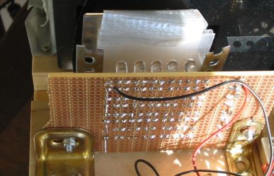 Auf dem Bild zu erkennen ist ebenfalls auf dem Boden des Chassis eine Doppelsteckdose und ein altes Notebooktrafo. Dieses liefert die benötigten 18 Volt für die LEDs, in die andere freie Steckdose kommt ein kleiner Trafo für die 12 Volt für den Synchronschaltkreis und den Audio-Verstärker.