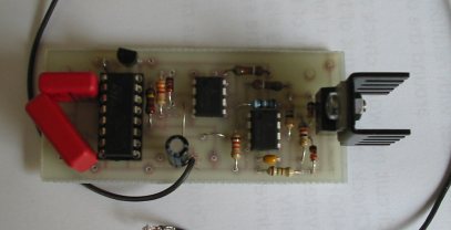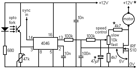 Als Optokoppler kommen bei mir eine Infrarotdiode nebst passendem Empfänger zum Einsatz, dadurch gibt es weniger Störungen mit dem LED-array. Außerdem ist es weise, die Lichtschranke auf der entgegengesetzten Seite aufzubauen, nicht gerade neben dem Bild. Ich habe lange gerätselt, warum der Schaltkreis bei mir nicht funktionierte. Die notwendige Umdrehungszahl wurde bei weitem überschritten. Nach vielen Experimenten mit Widerständen usw. habe ich kurzerhand die Stromversorgung des Synchronschaltkreises auf 7,5 Volt (Netzteil) reduziert. Jetzt läuft es.